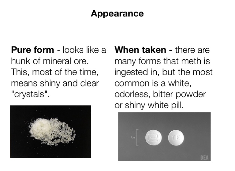 When taken - there are many forms that meth is ingested in, but the most common is a white, odorless, bitter powder or shiny white pill.