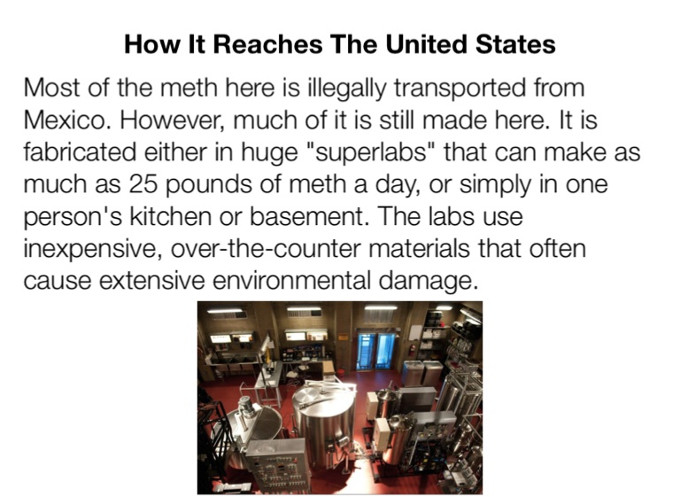 Most of the meth here is illegally transported from Mexico. However, much of it is still made here. It is fabricated either in huge "superlabs" that can make as much as 25 pounds of meth a day, or simply in one person's kitchen or basement. The labs use inexpensive, over-the-counter materials that often cause extensive environmental damage.