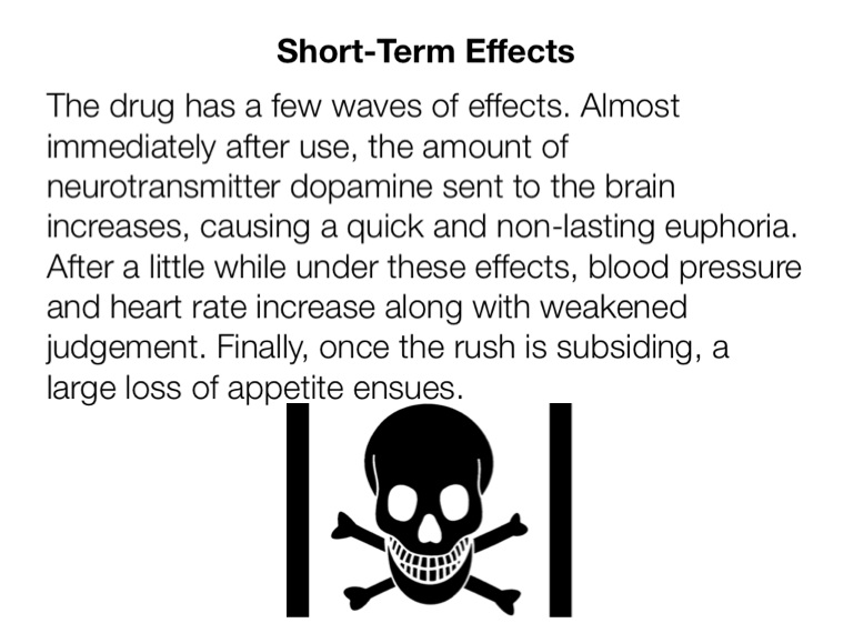The drug has a few waves of effects. Almost immediately after use, the amount of neurotransmitter dopamine sent to the brain increases, causing a quick and non-lasting euphoria. After a little while under these effects, blood pressure and heart rate increase along with weakened judgement. Finally, once the rush is subsiding, a large loss of appetite ensues.