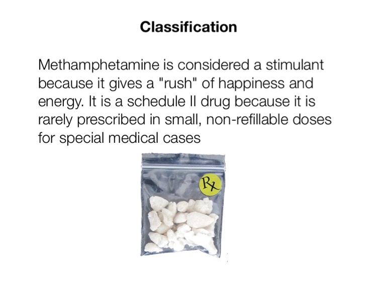 Methamphetamine is considered a stimulant because it gives a "rush" of happiness and energy. It is a schedule II drug because it is rarely prescribed in small, non-refillable doses for special medical cases
