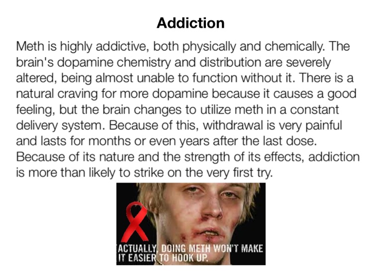 Meth is highly addictive, both physically and chemically. The brain's dopamine chemistry and distribution are severely altered, being almost unable to function without it. There is a natural craving for more dopamine because it causes a good feeling, but the brain changes to utilize meth in a constant delivery system. Because of this, withdrawal is very painful and lasts for months or even years after the last dose. Because of its nature and the strength of its effects, addiction is more than likely to strike on the very first try.