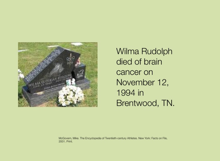 Wilma Rudolph died of brain cancer on November 12, 1994 in Brentwood, TN.