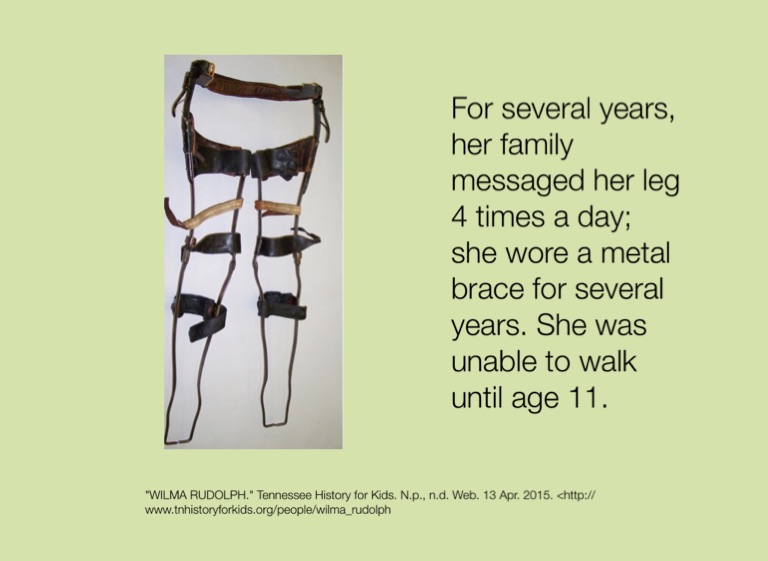 "WILMA RUDOLPH." Tennessee History for Kids. N.p., n.d. Web. 13 Apr. 2015. <http://www.tnhistoryforkids.org/people/wilma_rudolph