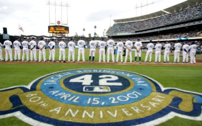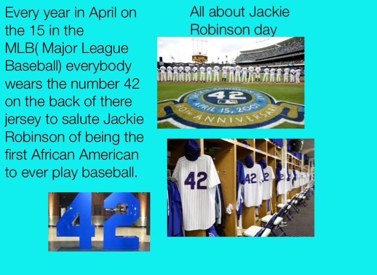 Every year in April on the 15 in the MLB( Major League Baseball) everybody wears the number 42 on the back of there jersey to salute Jackie Robinson of being the first African American to ever play baseball.