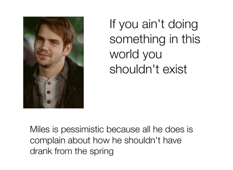 Miles is pessimistic because all he does is complain about how he shouldn't have drank from the spring