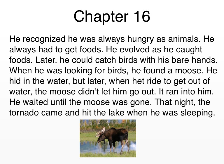 He recognized he was always hungry as animals. He always had to get foods. He evolved as he caught foods. Later, he could catch birds with his bare hands. When he was looking for birds, he found a moose. He hid in the water, but later, when het ride to get out of water, the moose didn't let him go out. It ran into him. He waited until the moose was gone. That night, the tornado came and hit the lake when he was sleeping.