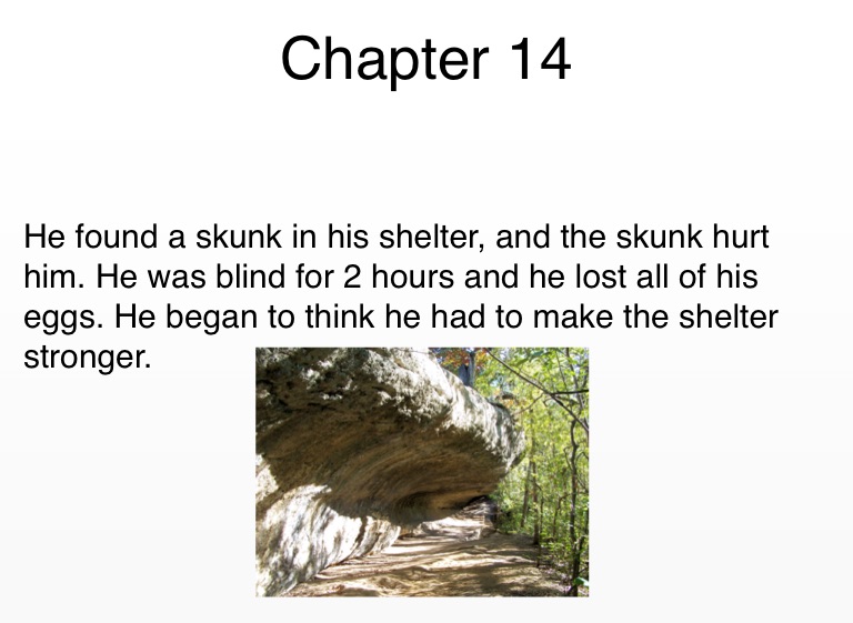 He found a skunk in his shelter, and the skunk hurt him. He was blind for 2 hours and he lost all of his eggs. He began to think he had to make the shelter stronger.