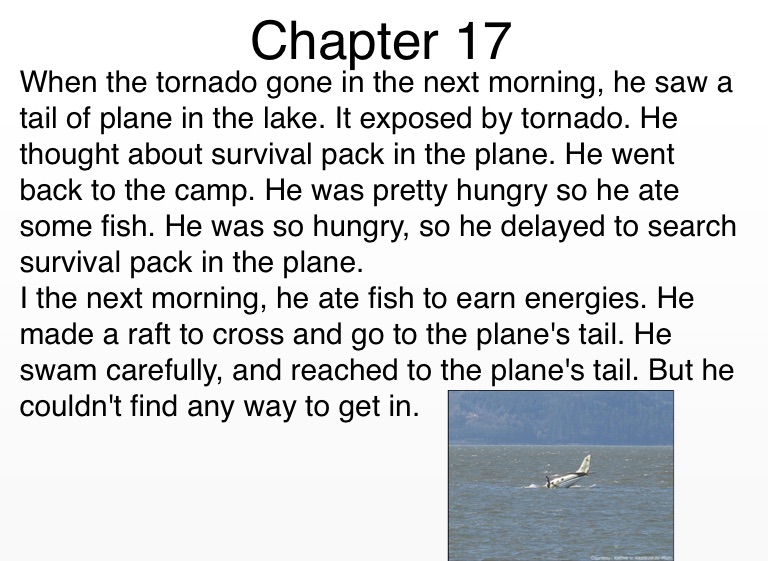 I the next morning, he ate fish to earn energies. He made a raft to cross and go to the plane's tail. He swam carefully, and reached to the plane's tail. But he couldn't find any way to get in.