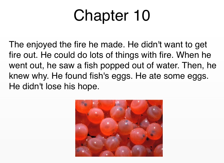 The enjoyed the fire he made. He didn't want to get fire out. He could do lots of things with fire. When he went out, he saw a fish popped out of water. Then, he knew why. He found fish's eggs. He ate some eggs. He didn't lose his hope.
