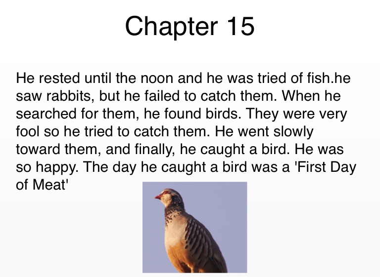 He rested until the noon and he was tried of fish.he saw rabbits, but he failed to catch them. When he searched for them, he found birds. They were very fool so he tried to catch them. He went slowly toward them, and finally, he caught a bird. He was so happy. The day he caught a bird was a 'First Day of Meat'