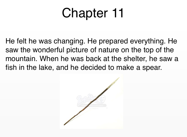 He felt he was changing. He prepared everything. He saw the wonderful picture of nature on the top of the mountain. When he was back at the shelter, he saw a fish in the lake, and he decided to make a spear.