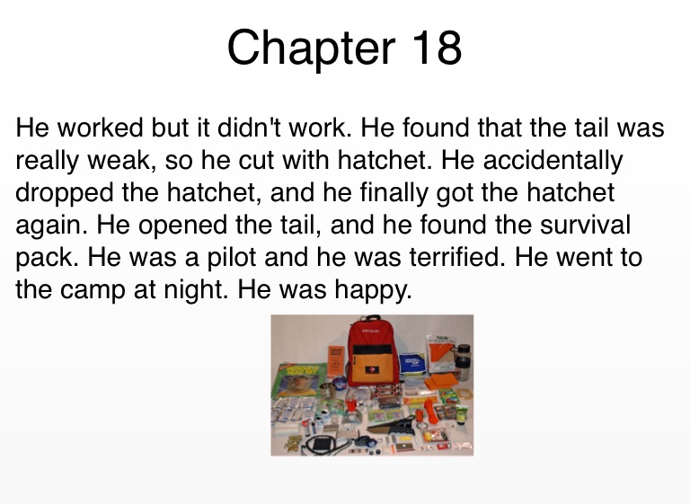 He worked but it didn't work. He found that the tail was really weak, so he cut with hatchet. He accidentally dropped the hatchet, and he finally got the hatchet again. He opened the tail, and he found the survival pack. He was a pilot and he was terrified. He went to the camp at night. He was happy.