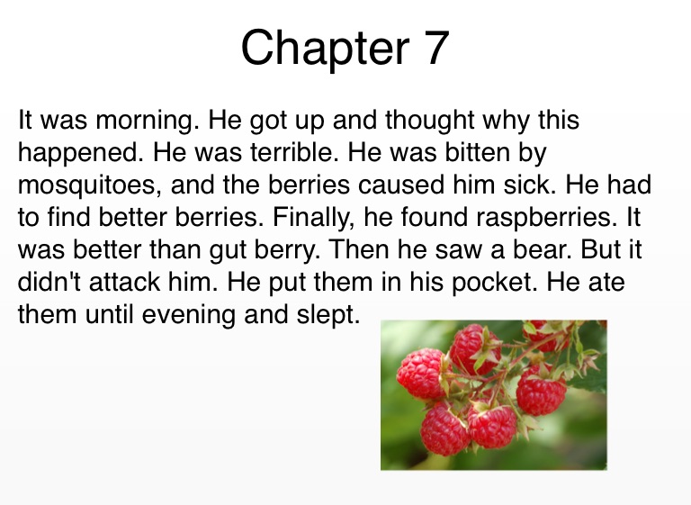 It was morning. He got up and thought why this happened. He was terrible. He was bitten by mosquitoes, and the berries caused him sick. He had to find better berries. Finally, he found raspberries. It was better than gut berry. Then he saw a bear. But it didn't attack him. He put them in his pocket. He ate them until evening and slept.