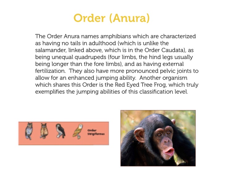 The Order Anura names amphibians which are characterized as having no tails in adulthood (which is unlike the salamander, linked above, which is in the Order Caudata), as being unequal quadrupeds (four limbs, the hind legs usually being longer than the fore limbs), and as having external fertilization. They also have more pronounced pelvic joints to allow for an enhanced jumping ability. Another organism which shares this Order is the Red Eyed Tree Frog, which truly exemplifies the jumping abilities of this classification level.