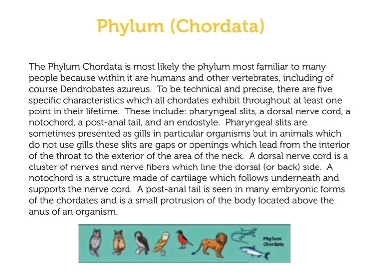 The Phylum Chordata is most likely the phylum most familiar to many people because within it are humans and other vertebrates, including of course Dendrobates azureus. To be technical and precise, there are five specific characteristics which all chordates exhibit throughout at least one point in their lifetime. These include: pharyngeal slits, a dorsal nerve cord, a notochord, a post-anal tail, and an endostyle. Pharyngeal slits are sometimes presented as gills in particular organisms but in animals which do not use gills these slits are gaps or openings which lead from the interior of the throat to the exterior of the area of the neck. A dorsal nerve cord is a cluster of nerves and nerve fibers which line the dorsal (or back) side. A notochord is a structure made of cartilage which follows underneath and supports the nerve cord. A post-anal tail is seen in many embryonic forms of the chordates and is a small protrusion of the body located above the anus of an organism.