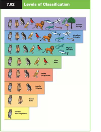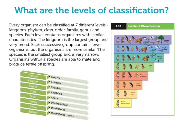 Every organism can be classified at 7 different levels - kingdom, phylum, class, order, family, genus and species. Each level contains organisms with similar characteristics. The kingdom is the largest group and very broad. Each successive group contains fewer organisms, but the organisms are more similar. The species is the smallest group and is very narrow. Organisms within a species are able to mate and produce fertile offspring.