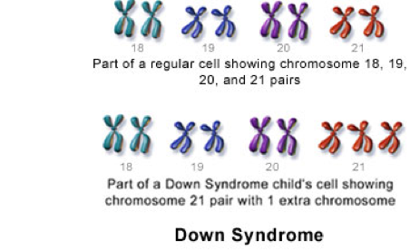 In all human body cells there is a nucleus, where genetic material is stored in our genes. Genes have the responsibility for all of our inherited traits and chromosomes. The nucleus of each cell contains 23 pairs of chromosomes, half of them are inherited from each parent. Down syndrome occurs when an individual has a full or partial extra copy of chromosome 21.