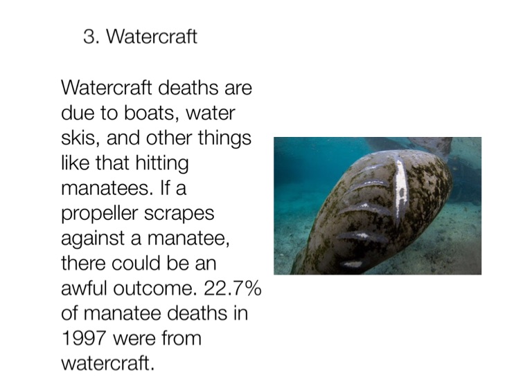 Watercraft deaths are due to boats, water skis, and other things like that hitting manatees. If a propeller scrapes against a manatee, there could be an awful outcome. 22.7% of manatee deaths in 1997 were from watercraft.