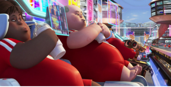 In the film you see a lot of parody. It's everywhere from drinks having full meals inside of them so they never have to have to do more than drink to consume a full meal, to no one walking and having unnecessary technology running things so no one has to do anything.