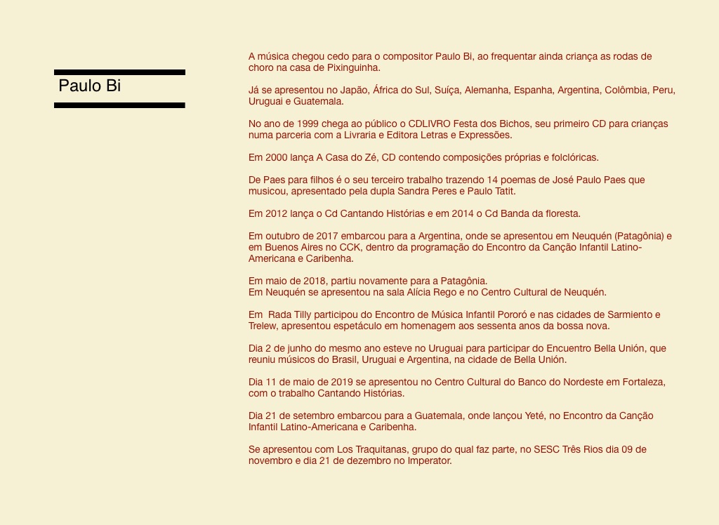De Paes para filhos é o seu terceiro trabalho trazendo 14 poemas de José Paulo Paes que musicou, apresentado pela dupla Sandra Peres e Paulo Tatit.