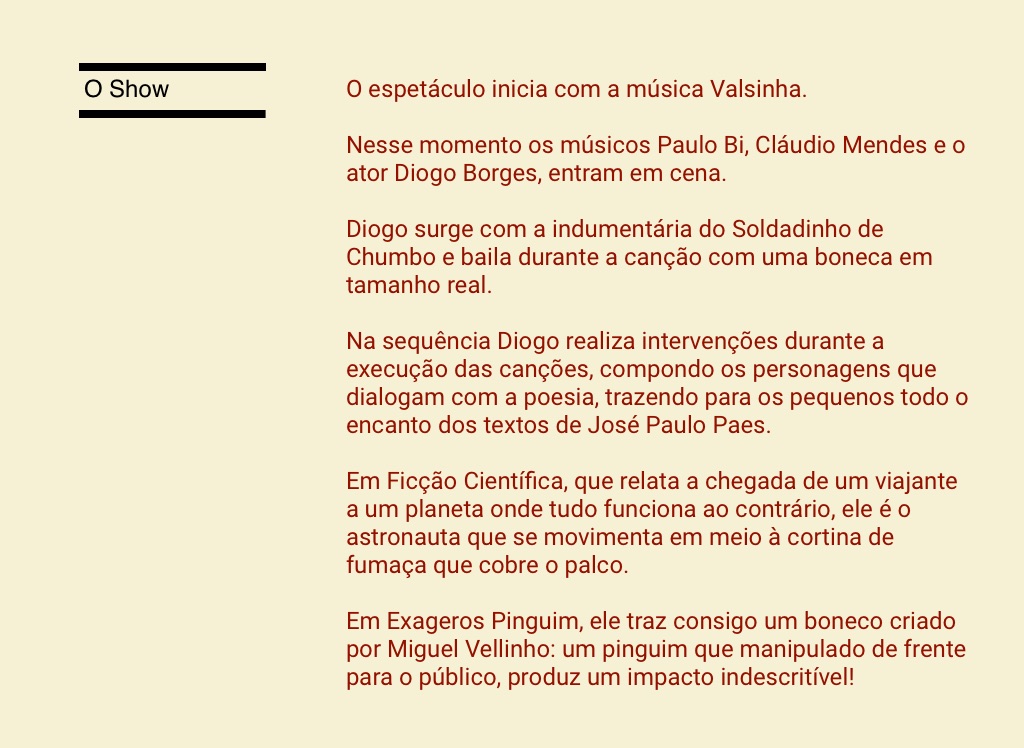 Na sequência Diogo realiza intervenções durante a execução das canções, compondo os personagens que dialogam com a poesia, trazendo para os pequenos todo o encanto dos textos de José Paulo Paes.