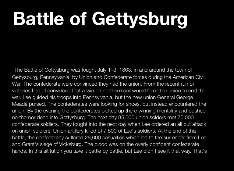 The Battle of Gettysburg was fought July 1–3, 1863, in and around the town of Gettysburg, Pennsylvania, by Union and Confederate forces during the American Civil War. The confederate were convinced they had the union. From the recent run of victories Lee of convinced that a win on northern soil would force the union to end the war. Lee guided his troops into Pennsylvania, but the new union General George Meade pursed. The confederates were looking for shoes, but instead encountered the union. By the evening the confederates picked up there winning mentality and pushed northerner deep into Gettysburg. The next day 85,000 union solders met 75,000 confederate soldiers. They fought into the next day when Lee ordered an all out attack on union soldiers. Union artillery killed of 7,500 of Lee's soldiers. At the end of this battle, the confederacy suffered 28,000 casualties which led to the surrender from Lee and Grant's siege of Vicksburg. The blood was on the overly confident confederate hands. In this sititution you take it battle by battle, but Lee didn't see it that way. That's what cost him.