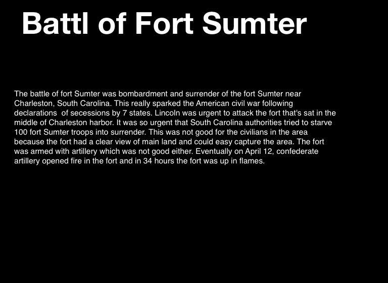 The battle of fort Sumter was bombardment and surrender of the fort Sumter near Charleston, South Carolina. This really sparked the American civil war following declarations of secessions by 7 states. Lincoln was urgent to attack the fort that's sat in the middle of Charleston harbor. It was so urgent that South Carolina authorities tried to starve 100 fort Sumter troops into surrender. This was not good for the civilians in the area because the fort had a clear view of main land and could easy capture the area. The fort was armed with artillery which was not good either. Eventually on April 12, confederate artillery opened fire in the fort and in 34 hours the fort was up in flames.
