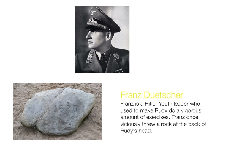 Franz is a Hitler Youth leader who used to make Rudy do a vigorous amount of exercises. Franz once viciously threw a rock at the back of Rudy's head.