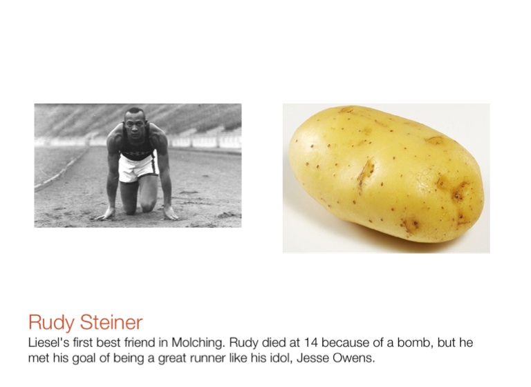 Liesel's first best friend in Molching. Rudy died at 14 because of a bomb, but he met his goal of being a great runner like his idol, Jesse Owens.