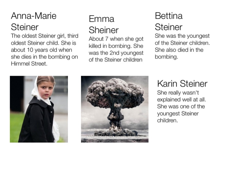 The oldest Steiner girl, third oldest Steiner child. She is about 10 years old when she dies in the bombing on Himmel Street.