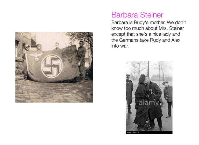 Barbara is Rudy's mother. We don't know too much about Mrs. Steiner except that she's a nice lady and the Germans take Rudy and Alex into war.