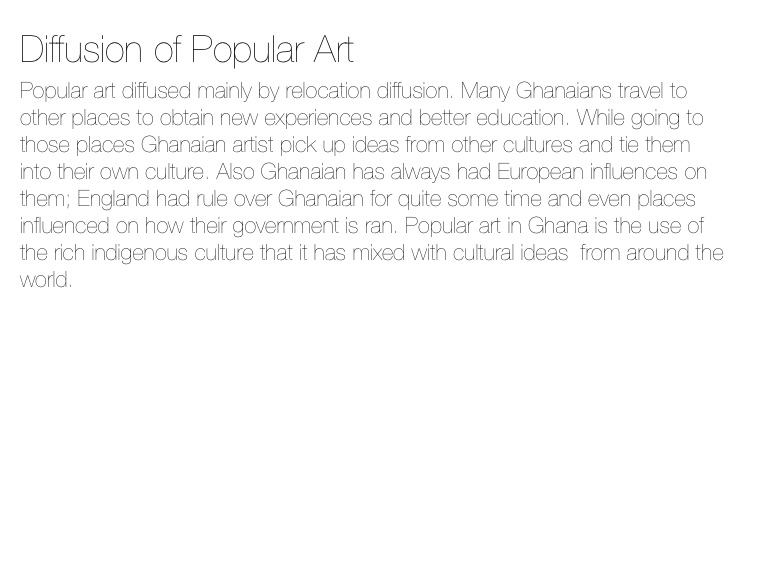 Popular art diffused mainly by relocation diffusion. Many Ghanaians travel to other places to obtain new experiences and better education. While going to those places Ghanaian artist pick up ideas from other cultures and tie them into their own culture. Also Ghanaian has always had European influences on them; England had rule over Ghanaian for quite some time and even places influenced on how their government is ran. Popular art in Ghana is the use of the rich indigenous culture that it has mixed with cultural ideas from around the world.