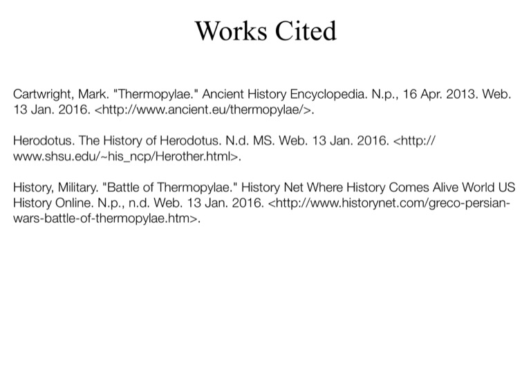 History, Military. "Battle of Thermopylae." History Net Where History Comes Alive World US History Online. N.p., n.d. Web. 13 Jan. 2016. <http://www.historynet.com/greco-persian-wars-battle-of-thermopylae.htm>.