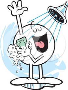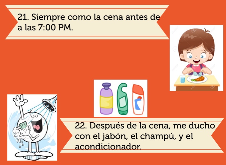 22. Después de la cena, me ducho con el jabón, el champú, y el acondicionador.