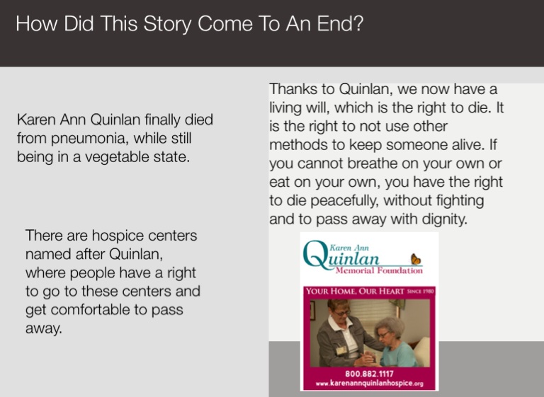 There are hospice centers named after Quinlan, where people have a right to go to these centers and get comfortable to pass away.