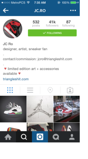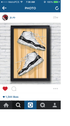 This is another way I use storytelling today. I follow his page because he expresses his love for sneakers in a beautiful way of art. On the left is one of my favorite art pieces by him cause it's one of my favorite sneakers. On the right is his Instagram page which is @jc.ro