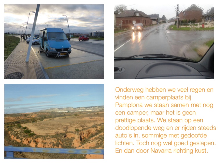 Onderweg hebben we veel regen en vinden een camperplaats bij Pamplona we staan samen met nog een camper, maar het is geen prettige plaats. We staan op een doodlopende weg en er rijden steeds auto's in, sommige met gedoofde lichten. Toch nog wel goed geslapen. En dan door Navarra richting kust.