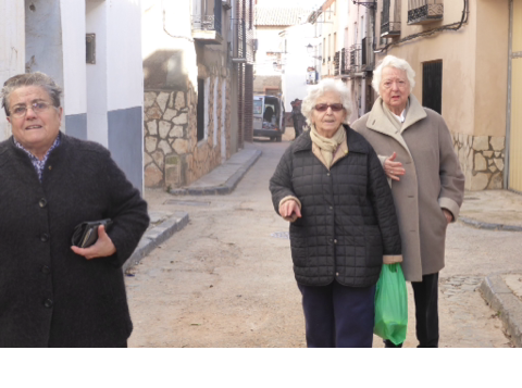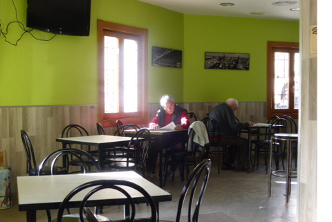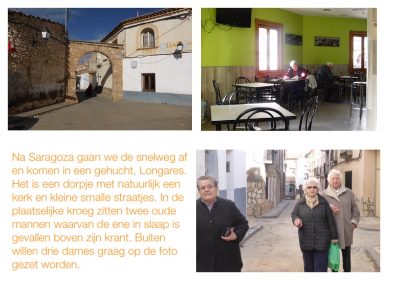 Na Saragoza gaan we de snelweg af en komen in een gehucht, Longares. Het is een dorpje met natuurlijk een kerk en kleine smalle straatjes. In de plaatselijke kroeg zitten twee oude mannen waarvan de ene in slaap is gevallen boven zijn krant. Buiten willen drie dames graag op de foto gezet worden.