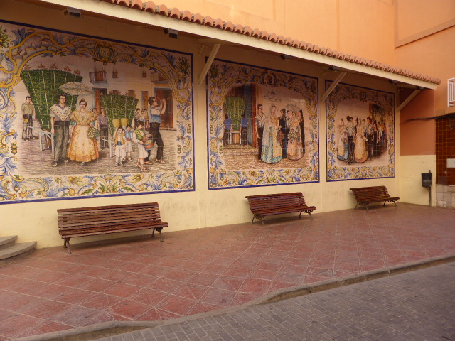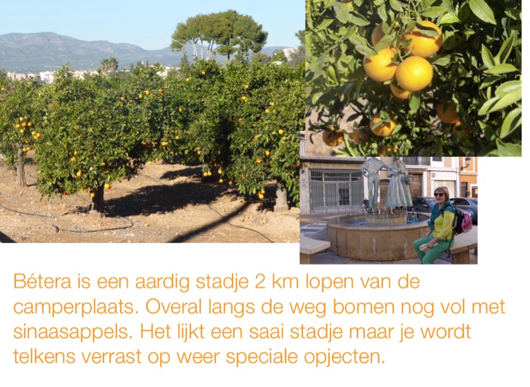 Bétera is een aardig stadje 2 km lopen van de camperplaats. Overal langs de weg bomen nog vol met sinaasappels. Het lijkt een saai stadje maar je wordt telkens verrast op weer speciale opjecten.