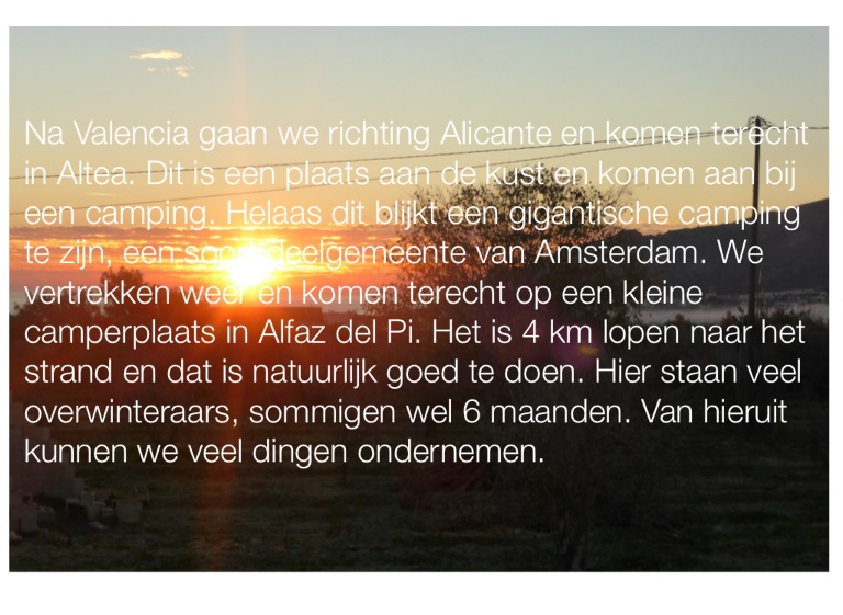 Na Valencia gaan we richting Alicante en komen terecht in Altea. Dit is een plaats aan de kust en komen aan bij een camping. Helaas dit blijkt een gigantische camping te zijn, een soort deelgemeente van Amsterdam. We vertrekken weer en komen terecht op een kleine camperplaats in Alfaz del Pi. Het is 4 km lopen naar het strand en dat is natuurlijk goed te doen. Hier staan veel overwinteraars, sommigen wel 6 maanden. Van hieruit kunnen we veel dingen ondernemen.