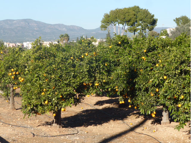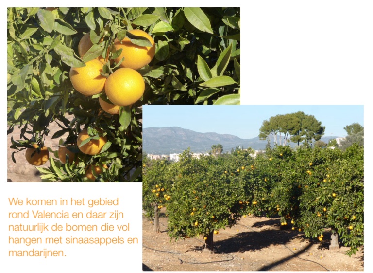 We komen in het gebied rond Valencia en daar zijn natuurlijk de bomen die vol hangen met sinaasappels en mandarijnen.