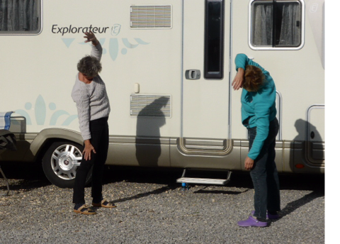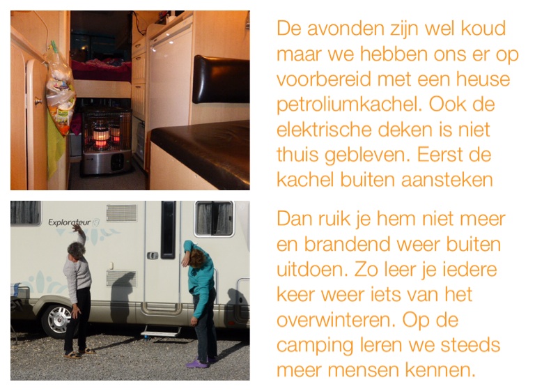 Dan ruik je hem niet meer en brandend weer buiten uitdoen. Zo leer je iedere keer weer iets van het overwinteren. Op de camping leren we steeds meer mensen kennen.