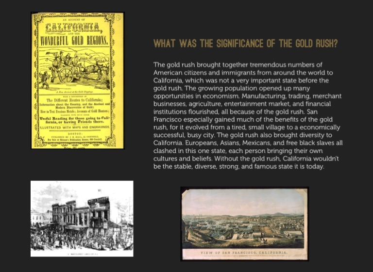 The gold rush brought together tremendous numbers of American citizens and immigrants from around the world to California, which was not a very important state before the gold rush. The growing population opened up many opportunities in economism. Manufacturing, trading, merchant businesses, agriculture, entertainment market, and financial institutions flourished, all because of the gold rush. San Francisco especially gained much of the benefits of the gold rush, for it evolved from a tired, small village to a economically successful, busy city. The gold rush also brought diversity to California. Europeans, Asians, Mexicans, and free black slaves all clashed in this one state, each person bringing their own cultures and beliefs. Without the gold rush, California wouldn't be the stable, diverse, strong, and famous state it is today.