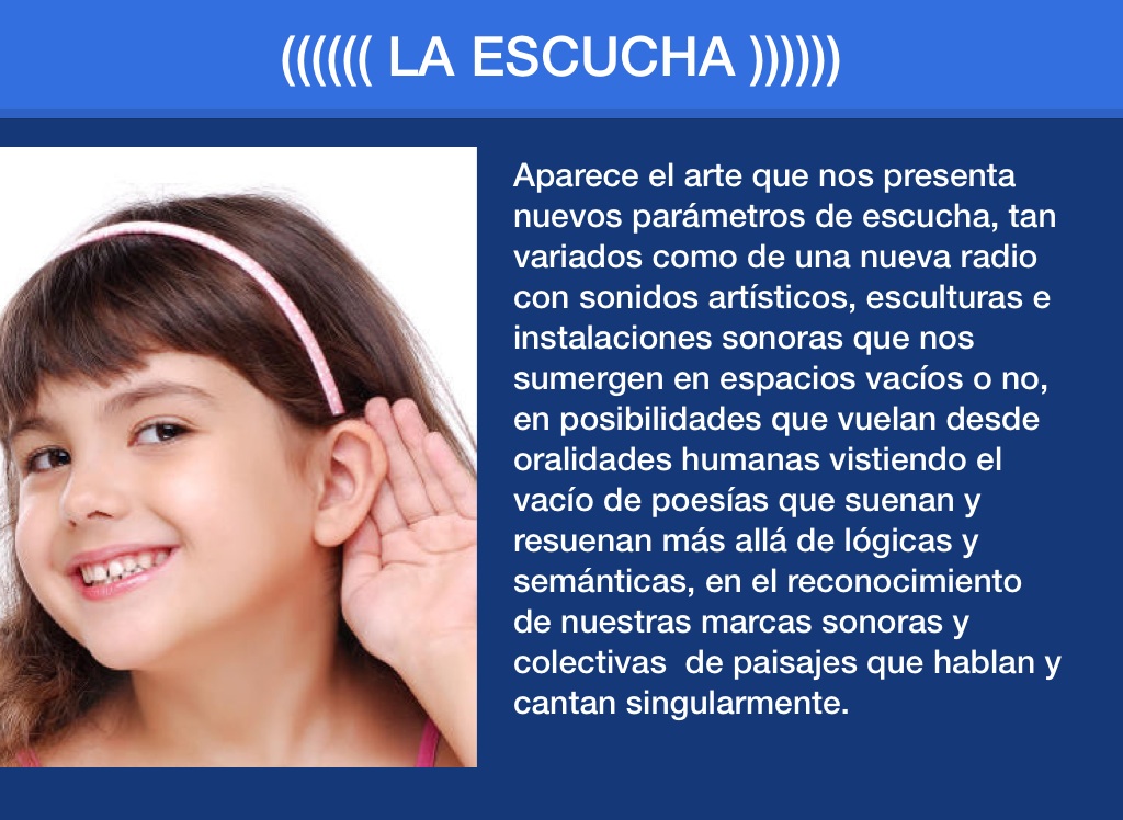 Aparece el arte que nos presenta nuevos parámetros de escucha, tan variados como de una nueva radio con sonidos artísticos, esculturas e instalaciones sonoras que nos sumergen en espacios vacíos o no, en posibilidades que vuelan desde oralidades humanas vistiendo el vacío de poesías que suenan y resuenan más allá de lógicas y semánticas, en el reconocimiento