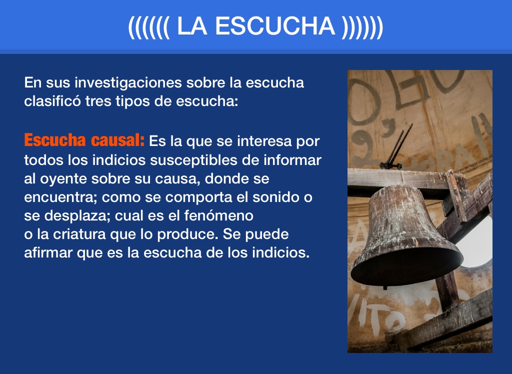 Escucha causal: Es la que se interesa por todos los indicios susceptibles de informar al oyente sobre su causa, donde se encuentra; como se comporta el sonido o se desplaza; cual es el fenómeno