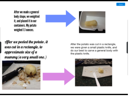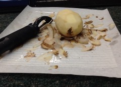The first step in the mummification process, was to peel the potato. The materials we needed, was a potato peeler, and a plastic map, to place the potato on, while it was being peeled.