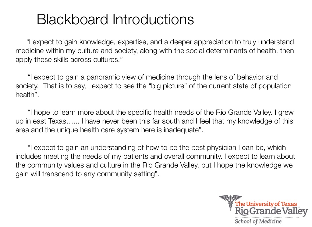 “I hope to learn more about the specific health needs of the Rio Grande Valley. I grew up in east Texas…... I have never been this far south and I feel that my knowledge of this area and the unique health care system here is inadequate”.