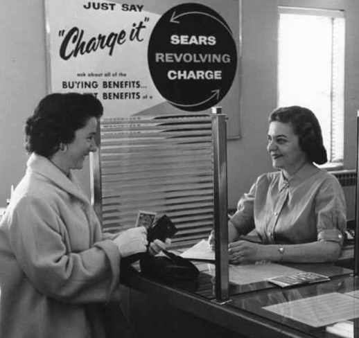 A woman buying an item with credit at one of the most popular stores of the 1920s: Sears