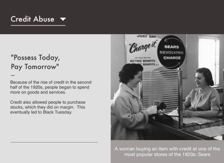 Credit also allowed people to purchase stocks, which they did on margin. This eventually led to Black Tuesday.
