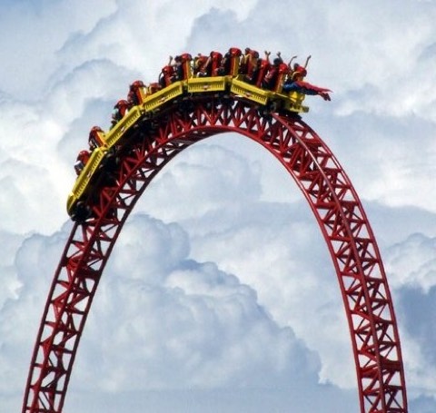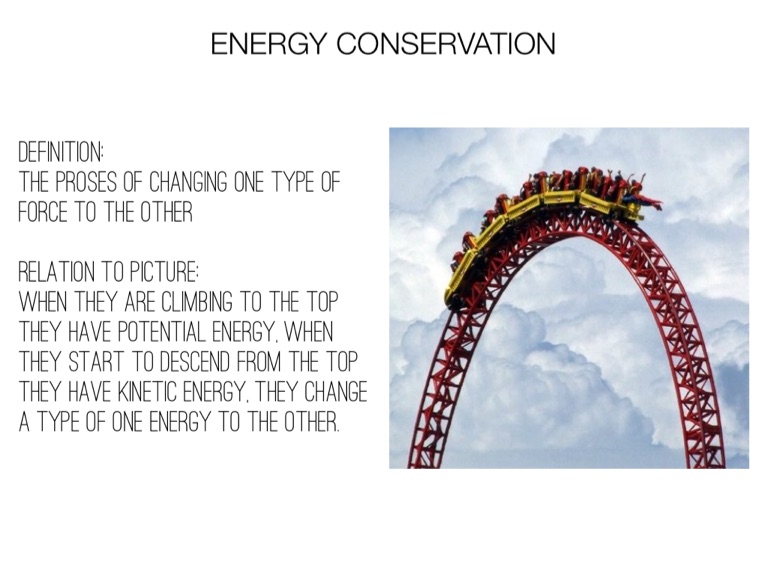 When they are climbing to the top they have potential energy, when they start to descend from the top they have Kinetic energy, they change a type of one energy to the other.
